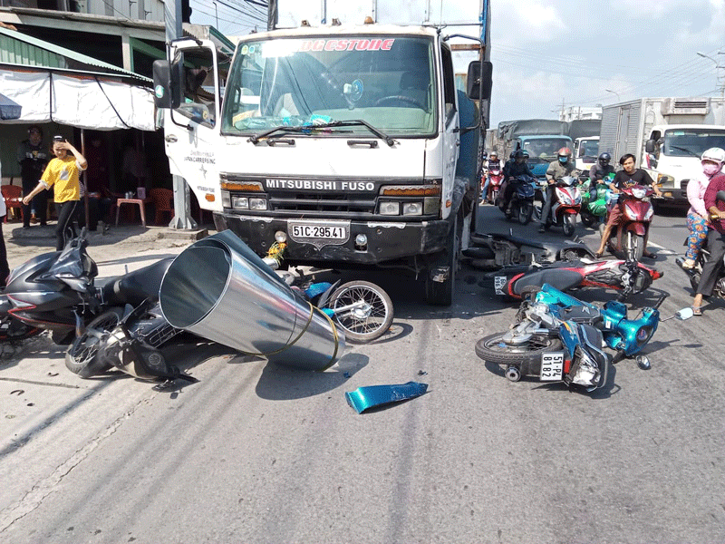 Vào thời điểm trên, có khoảng 10 xe máy đang dừng chờ đèn đỏ thì ô tô tải 51C-295.41 do tài xế Trần Hoàng Anh (35 tuổi, ngụ TP.HCM) điều khiển, lưu thông trên QL1 theo hướng từ huyện Bến Lức về Tiền Giang đã lao đến tông vào.