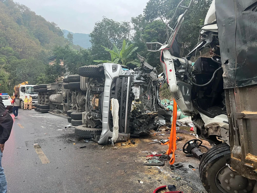 Sau tai nạn, cả hai xe lật nghiêng, biến dạng phần đầu và hư hỏng nặng, hai người trên xe đầu kéo tử vong tại chỗ, hai người trên ô tô tải bị thương.