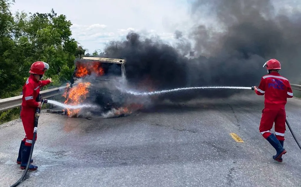 Tài xế đã nhanh chóng dừng xe và cố gắng dập lửa nhưng bất thành. Ngoài ra, do thời tiết nắng nóng oi bức kèm gió Lào khiến công tác chữa cháy gặp khó khăn.