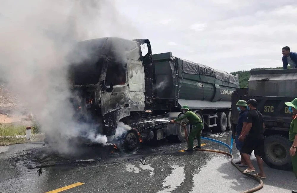 Vào thời điểm trên, thời tiết nắng nóng gay gắt, xe đầu kéo mang BKS 37C-320.47 kéo theo rơ-moóc mang BKS 37R-023.58 chạy trên quốc lộ 48D (xã Quỳnh Lập, thị xã Hoàng Mai) hướng ra Cảng Nghi Sơn (Thanh Hoá) thì bất ngờ bốc cháy từ phía cabin.