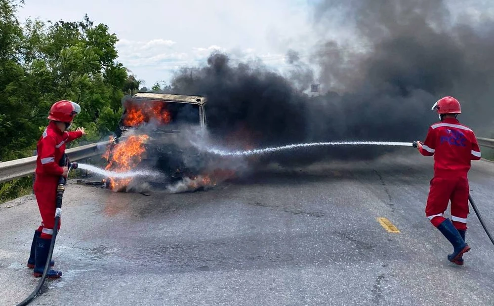 Đội Phòng cháy chữa cháy của Khu công nghiệp VSIP dập lửa cháy xe tải trên quốc lộ 1A tránh TP Vinh.