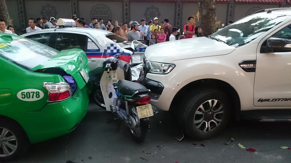 Theo ghi nhận tại đây, bốn chiếc xe ô tô bị hư hỏng, biến dạng, nhiều mảnh vỡ, kính vương tung tóe dưới nền đường. Chiếc xe máy bị biến dạng hoàn toàn nằm dưới gầm xe bán tải.