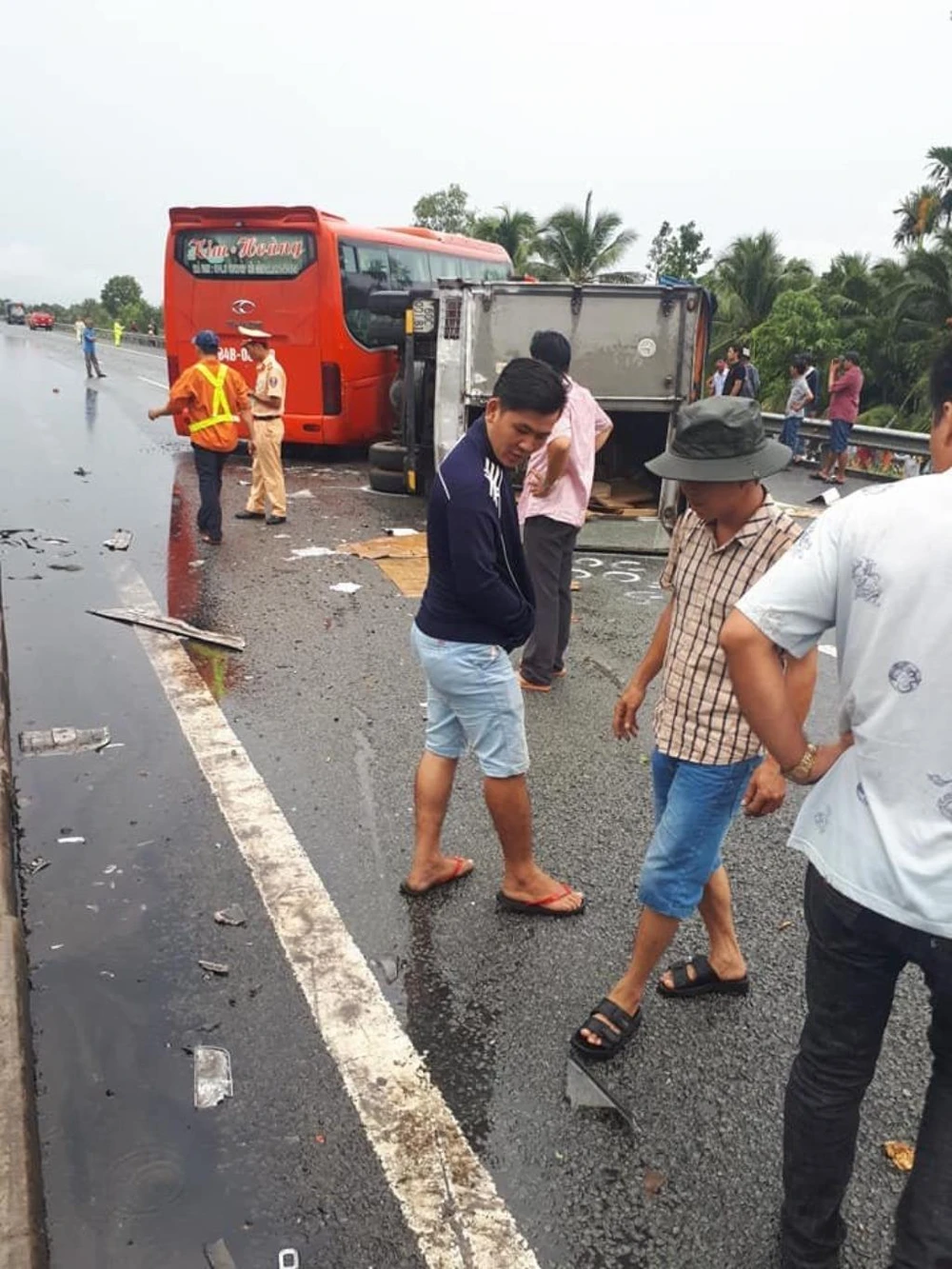 Theo thông tin ban đầu, khoảng 14 giờ 30, xe khách 45 chỗ 84B - 001… theo hướng TP.HCM đi Tiền Giang thì bất ngờ xảy ra va chạm với xe tải 60C-001… chạy cùng chiều, làm phương tiện này lật ngang.