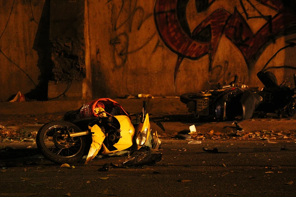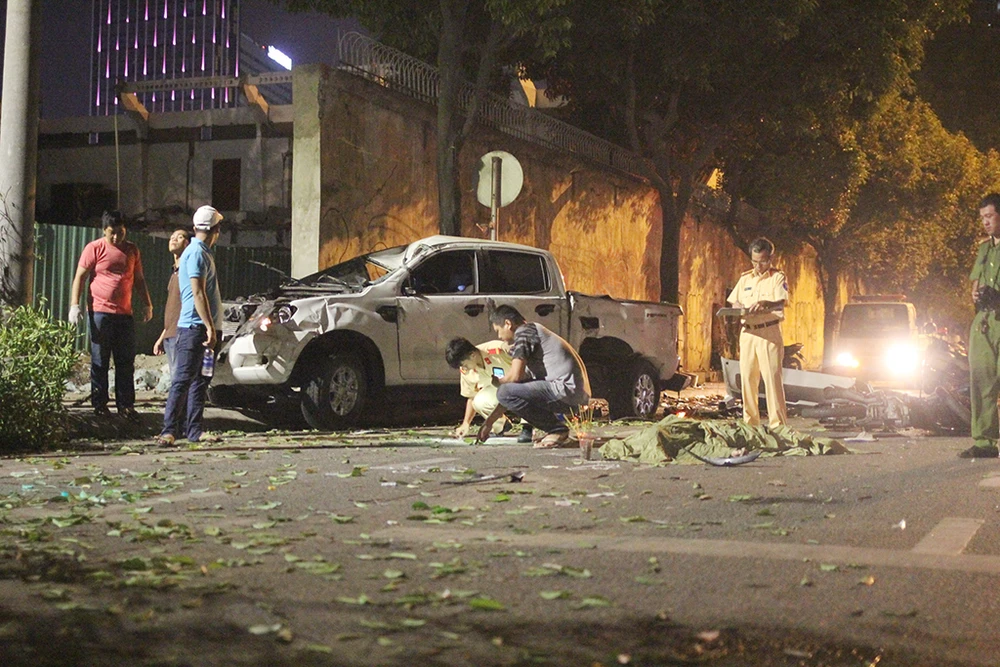 Xe bán tải tông hàng loạt xe máy trên đường Nguyễn Hữu Cảnh vào khuya 20-4. Ảnh: H.TÂM
