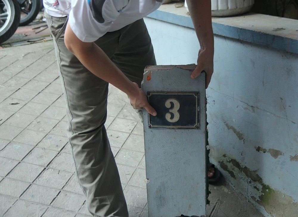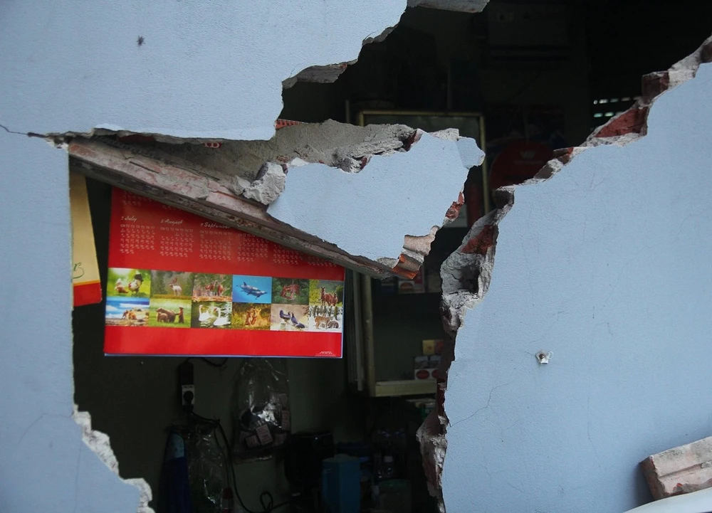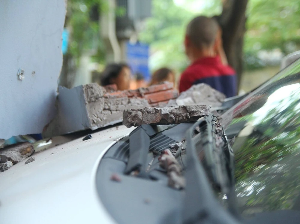 Bức tường bị bật tung, gạch vữa văng trên nắp capo ôtô.
