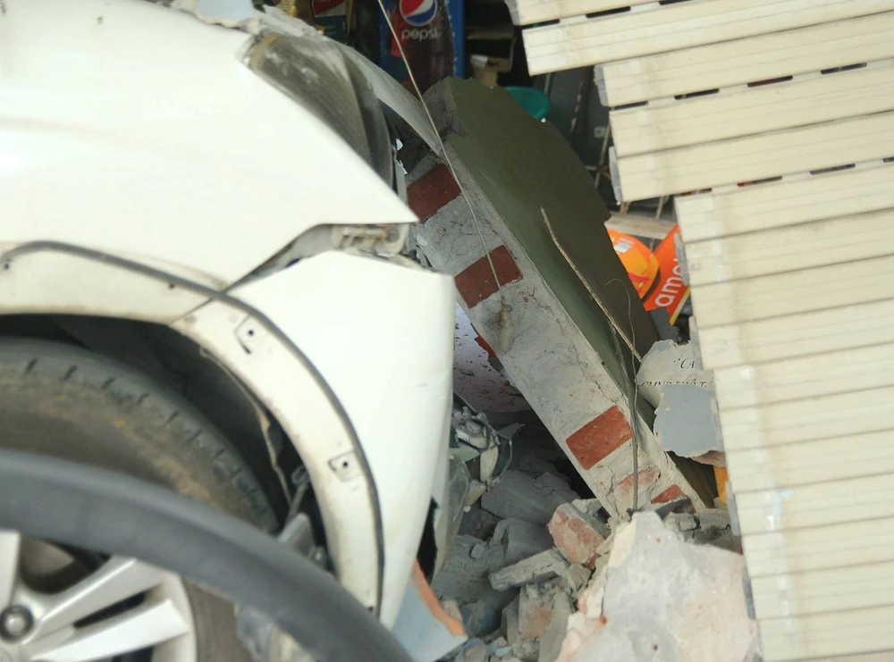 Cú húc mạnh khiến tường kiốt 8m2 bị vỡ, cửa cuốn méo mó, gạch vữa rơi vãi, nhiều vật dụng trong cửa hàng hư hỏng. Chiếc xe cũng bị vỡ phần đầu.