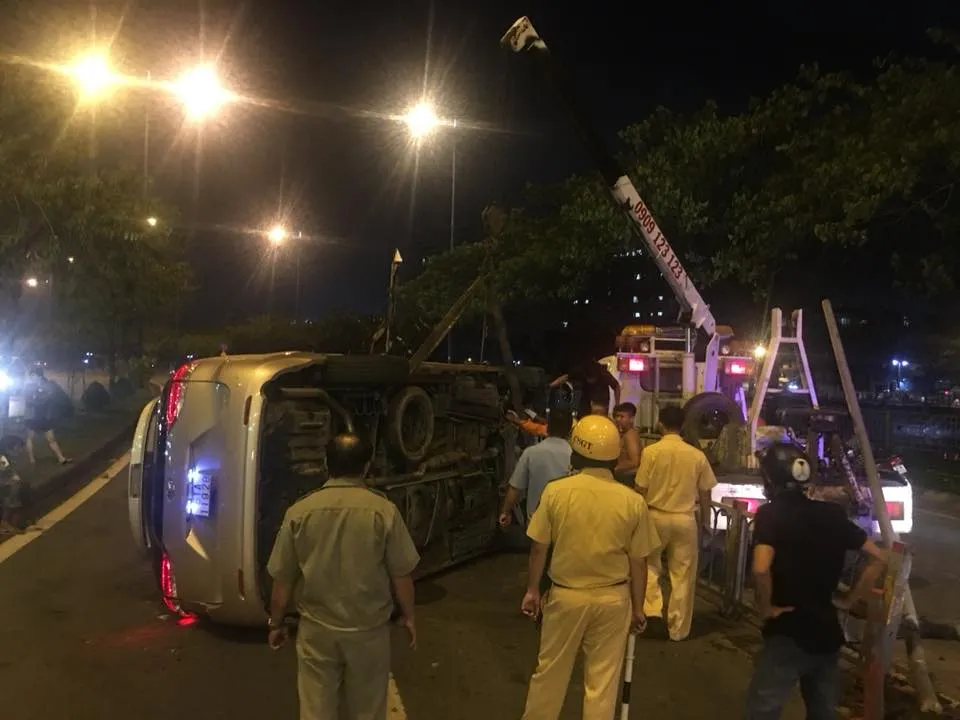 Tài xế vội đánh lái qua phải để tránh làm xe chao đảo, đâm thẳng vào trụ biển báo giao thông và hàng chục mét dải phân cách bằng sắt ngăn cách giữa hai làn trước khi lật giữa đường.