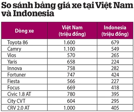Điển hình là một chiếc ô tô Toyota Vios ở Việt Nam giá 570 triệu đồng, trong khi đó chiếc xe này ở Indonesia có giá chỉ 265 triệu đồng. Tương tự xe Honda CRV 2.0AT ở Việt Nam hơn 1 tỉ đồng, còn ở nước bạn chỉ hơn 400 triệu đồng. Hay như chiếc Toyota Innova bán ở Indonesia chỉ 282 triệu đồng, còn ở Việt Nam lên đến gần 800 triệu đồng.