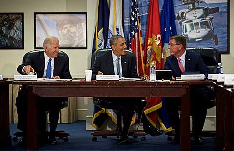 Tổng thống Obama, Phó Tổng thống Joe Biden và Bộ trưởng Quốc phòng Ashton Carter tại Lầu Năm Góc ngày 4-8. Ảnh: BỘ QUỐC PHÒNG MỸ
