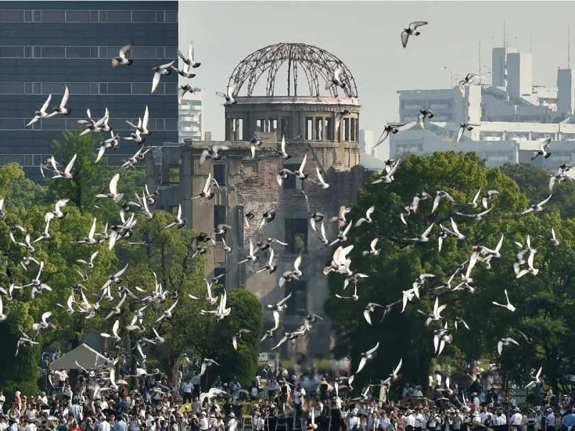 Bồ câu bay trên Công viên Tưởng niệm Hòa bình Hiroshima tại buổi tưởng niệm ngày 6-8-2015. (Ảnh: REUTERS)