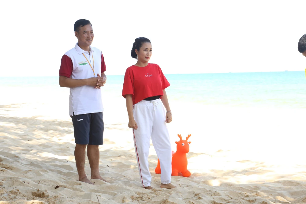 MC Ốc Thanh Vân dặn dò các cầu thủ nhí để nâng cao tinh thần khi tập luyện. Ảnh: BEE