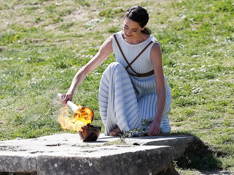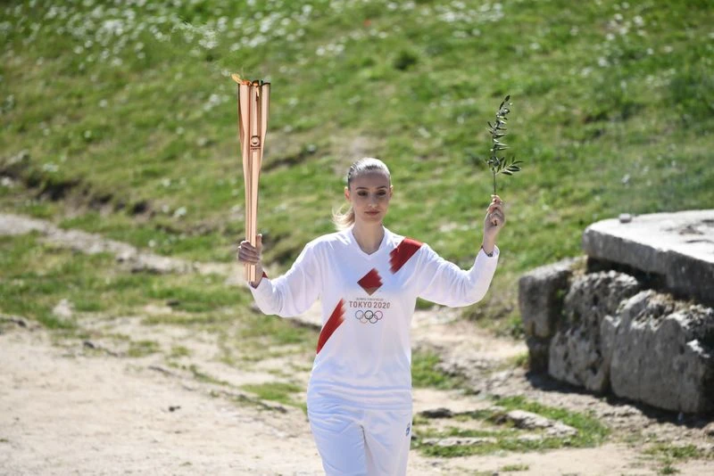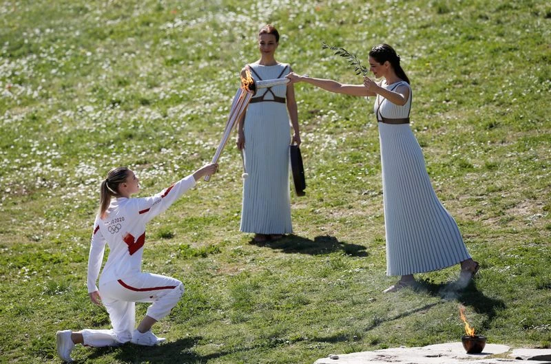 Những “nàng tiên giáng trần” lấy lửa từ… “thần mặt trời” châm lên ngọn đuốc bất diệt ở TP cổ Olympia, Hy Lạp để đưa ngọn lửa thiêng về Tokyo đã… toang giữa chừng vì COVID-19.