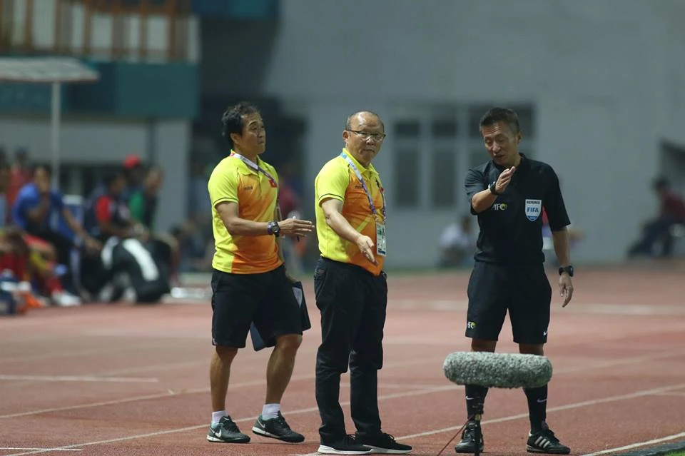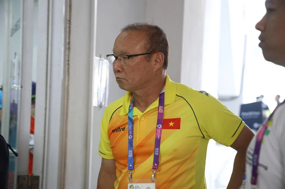 HLV Park Hang-seo chỉ đạo các cầu thủ Olympic Việt Nam ngoài đường biên.