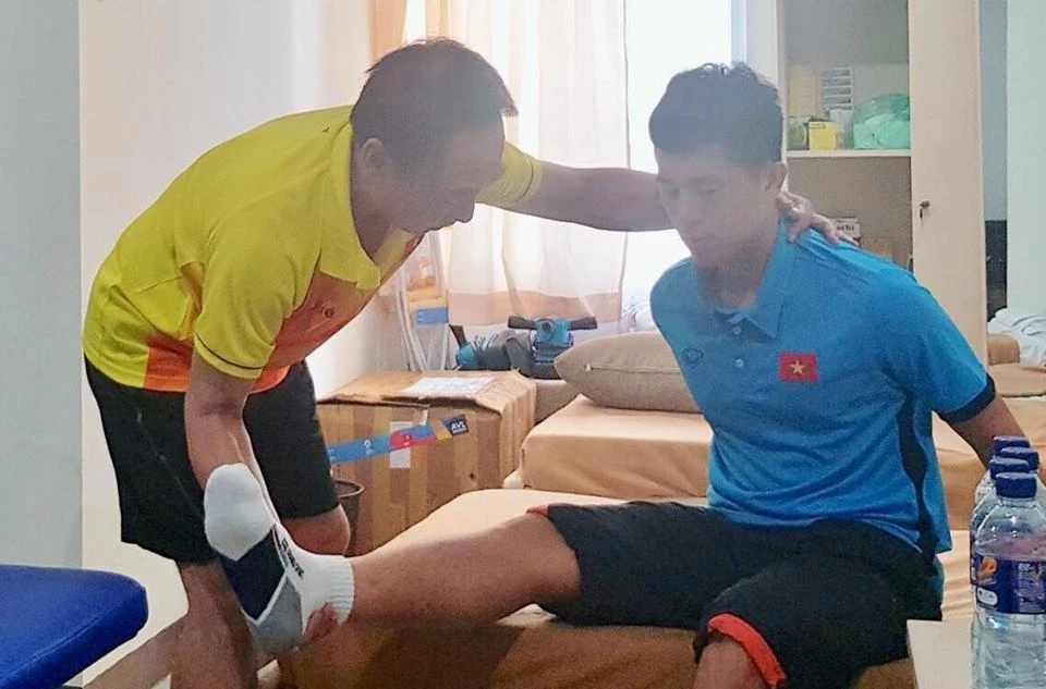 Tại đây, cầu thủ mang số áo 18 được ông Nguyễn Trọng Hiền, một trong những bác sĩ giàu kinh nghiệm nhất về chấn thương thể thao của Việt Nam, hiện đang là Phó Tiểu ban Y tế của Đoàn TTVN tham dự Asian Games 2018, Ủy viên Ban Y học VFF trực tiếp thăm khám và sử dụng máy xung để điều trị.