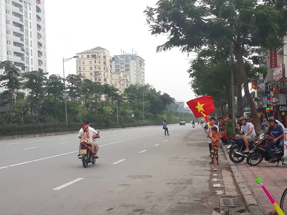 Các CĐV chờ đón đoàn xe chở đội Olympic Việt Nam đi qua. ẢNH: VIẾT THỊNH.