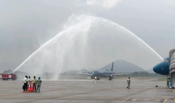Vòi rồng chào đón Olympic Việt Nam trở về Việt Nam. Ảnh: VNexpress.