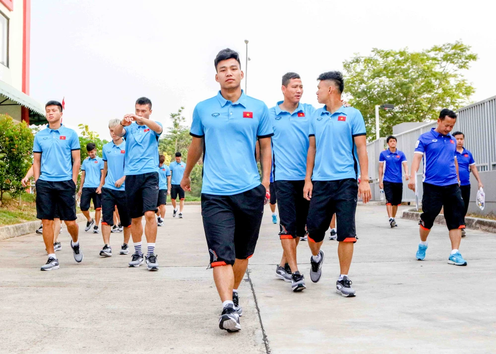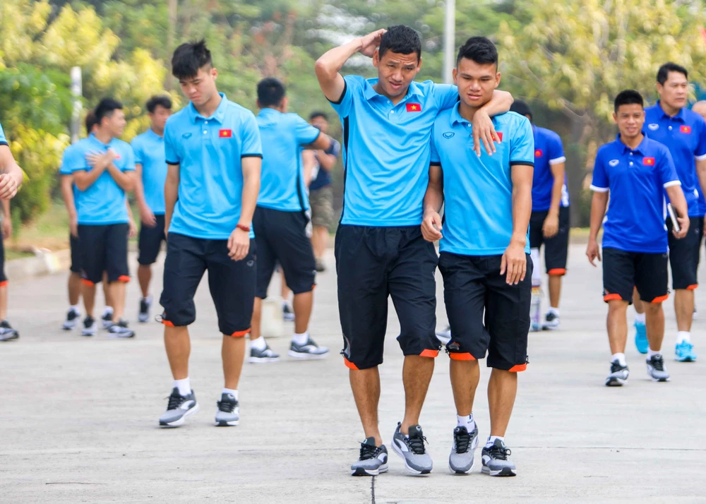 Vũ Văn Thanh đi đầu, phía sau là các tuyển thủ Olympic Việt Nam. Ảnh: HUY PHẠM