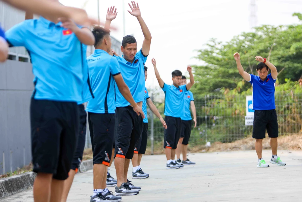 Các cầu thủ khá tập trung, xen lẫn lo lắng vì đã hai ngày rưỡi chưa được chạm bóng. Ảnh: HUY PHẠM