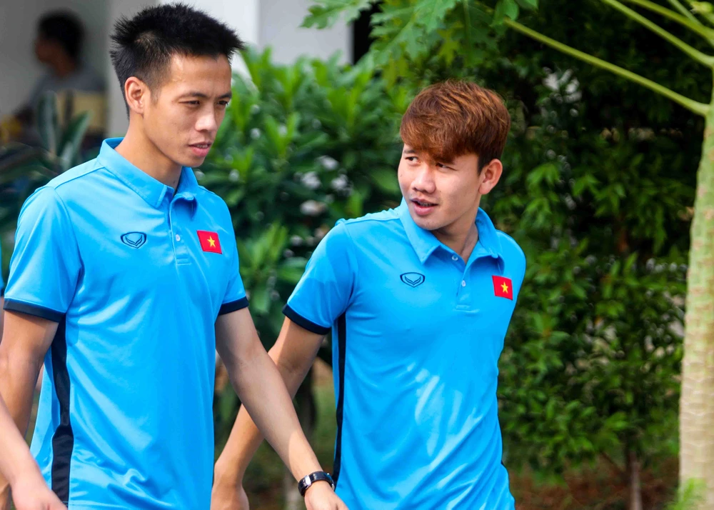 Đội trưởng Văn Quyết và Minh Vương sau khi kết thúc buổi tập. Ảnh: HUY PHẠM