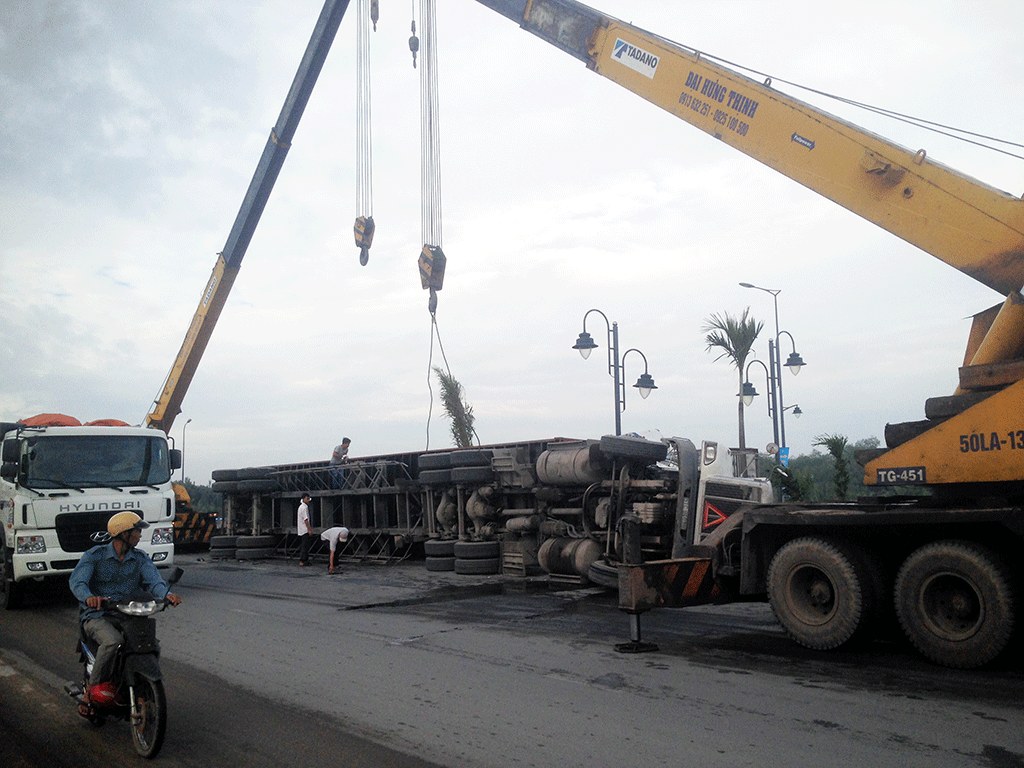 Xe container lật ngang giữa đường lúc đang ôm cua với tốc độ cao.
