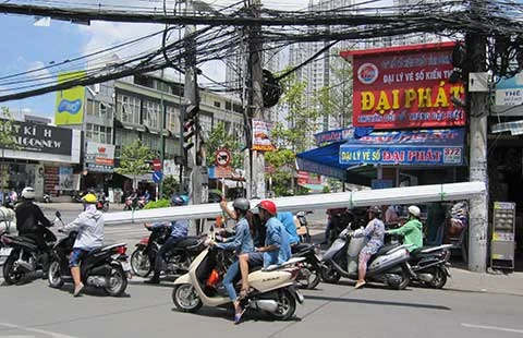 (PL)- Nhiều người dân phản ánh họ rất kinh sợ khi đi trên tuyến đường Nguyễn Thị Thập, Lê Văn Lương, Nguyễn Hữu Thọ... (quận 7, TP.HCM) bởi trên đường thường xuất hiện các xe máy chở nhiều cây nhôm dài chạy rất nhanh.
