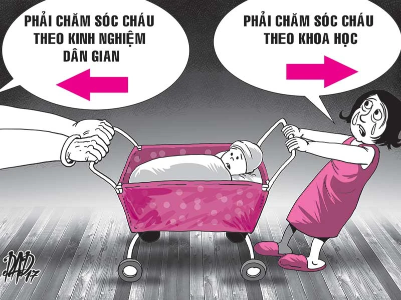 BS Nguyễn Thanh Sang, ĐH Y Dược TP.HCM, kể từng chứng kiến gia đình lục đục vì mâu thuẫn trong cách chăm sóc con cháu. Trường hợp này rất nghiêm trọng khi bà nội tự ý nhỏ chanh vào miệng cháu mới sinh vài giờ để cho ói đàm nhớt ra. Tuy nhiên, do đường thở và đường miệng thông nhau, em bé bị hít sặc khiến đường thở đóng lại, tím tái dẫn đến suy hô hấp phải cấp cứu gấp. Người mẹ khóc ngất, còn người chồng to tiếng với mẹ. Bà nội thì chống chế: “Ngày xưa mẹ cũng làm vậy mà có sao đâu”.