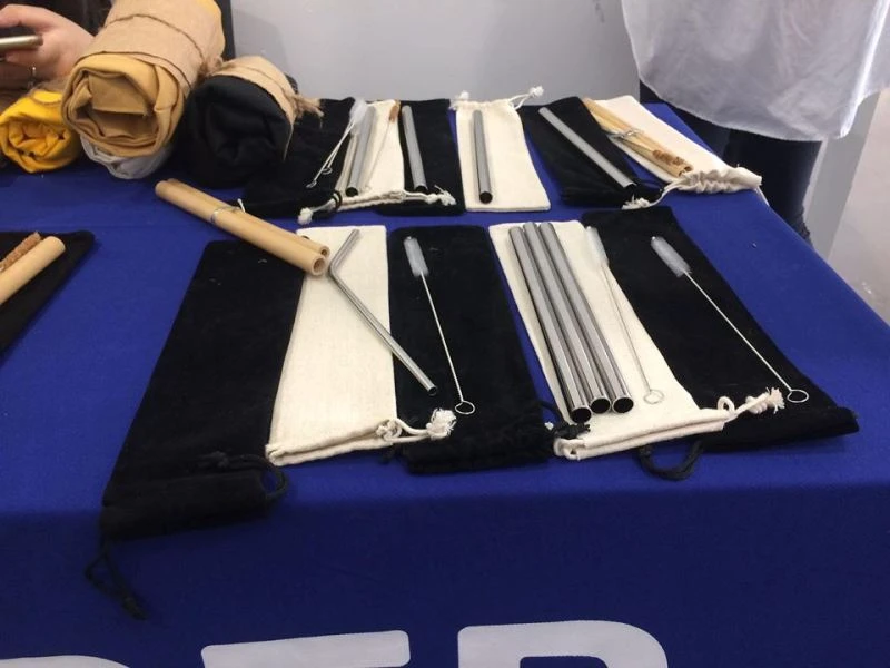 Ống inox, ống nhựa, túi vải thân thiện với môi trường do các bạn học sinh tự làm để gây quỹ cho dự án.