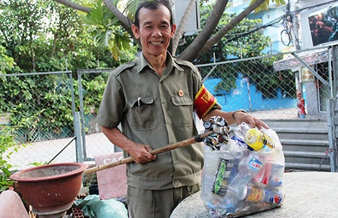 Cứ 5 giờ sáng, ông Nguyễn Hoàng Vũ (bảo vệ dân phố khu phố 8, phường 5, quận Gò Vấp) đã thức dậy, chế ấm trà nóng, khoác lên mình bộ đồ cũ thường ngày rồi xách túi nylon và cầm cây gậy có gắn nam châm để lượm nắp chai đi ra khỏi nhà. Ông Vũ hồ hởi: “Lượm ve chai đâu có cực gì đâu, y hệt tập thể dục đấy mà, vừa có thêm tiền mua gạo tặng bà con, vừa khỏe hẳn ra”.