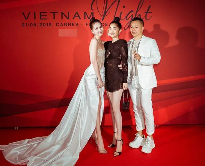 Vũ Khắc Tiệp cùng Ngọc Trinh và người mẫu của mình trong buổi tiệc ở Cannes và bán giá 5.000USD cho một số người muốn tham gia.