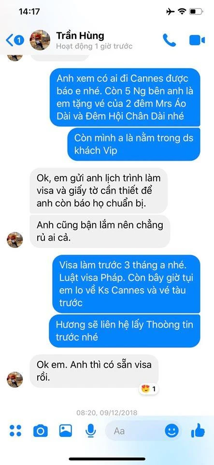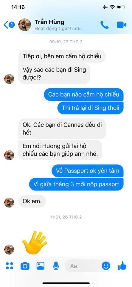 Vũ Khắc Tiệp cũng đáp lại rằng ông chỉ nhận ủy nhiệm chi chứ không phải cọc đồng thời cung cấp tin nhắn nói rằng mình sẽ thuê khách sạn, mua vé trước cho những người đi Cannes. Tuy nhiên, ông Tiệp cũng đưa ra một tin nhắn phù hợp với thông tin của nick PH phản hồi rằng những người đến Cannes được làm visa nên giao hộ chiếu cho phía ông Tiệp, vợ chồng họ không được báo làm visa nên không được yêu cầu cung cấp hộ chiếu.