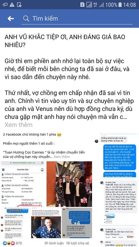 Ngày 28-7, doanh nhân PH đã lên facebook tố cáo ông Vũ Khắc Tiệp, Giám đốc Công ty người mẫu Venus, người được biết đến là ông bầu của người mẫu Ngọc Trinh – đã chiếm đoạt của vợ chồng mình số tiền 116,5 triệu đồng.