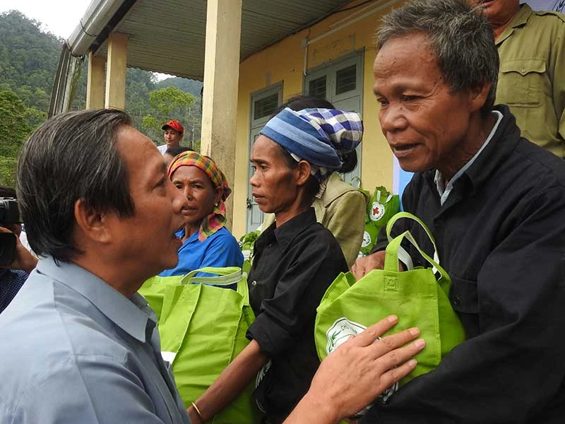 Bí thư Tỉnh ủy Quảng Bình (trái) tặng quà cho ông Đinh Nê, động viên dân bản đừng rời bản vào hang. Ảnh: MINH QUÊ