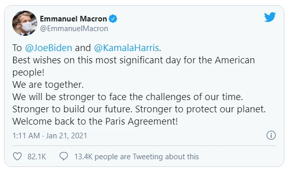 Tổng thống Macron hoan nghênh quyết định của Tổng thống Biden khi đưa Mỹ tái gia nhập Hiệp định Khí hậu Paris. Ảnh: TWITTER