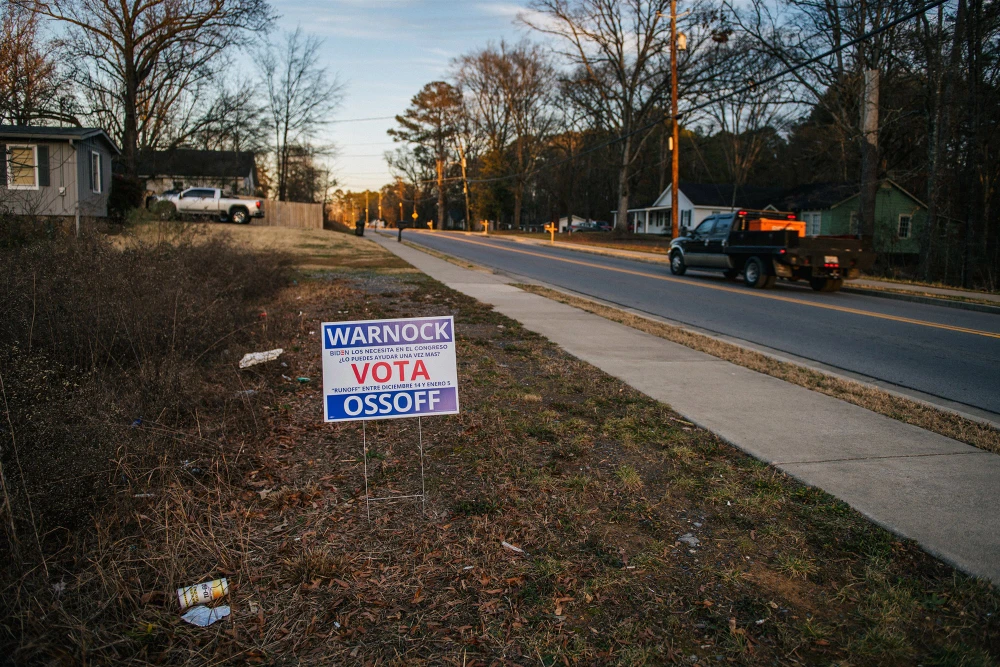Bảng hiệu ủng hộ bầu cử cho các ứng cử viên Thượng viện Dân chủ Jon Ossoff và Raphael Warnock ở Georgia, ngày 3-1. Ảnh: NBC News