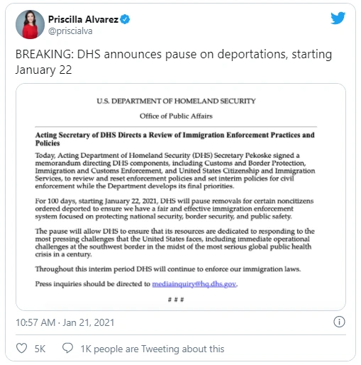 Việc tạm dừng sẽ cho phép Bộ An ninh Nội địa đảm bảo "thực thi nhập cư hiệu quả và công bằng" và tập trung vào đảm bảo an ninh tại biên giới Mỹ - Mexico cũng như phòng chống nguy cơ từ đại dịch COVID-19.