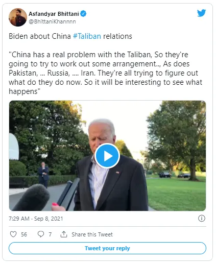"Trung Quốc thực sự sẽ gặp nhiều vấn đề với Taliban” - Tổng thống Biden trả lời khi ông được hỏi liệu Trung Quốc có lên kế hoạch hỗ trợ cho Taliban hay không.