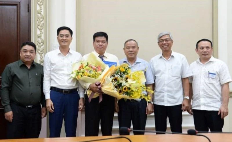 Ông Bùi Hòa An (người cầm hoa) nhận quyết định nhiệm vụ mới. Ảnh: PHƯƠNG THÙY