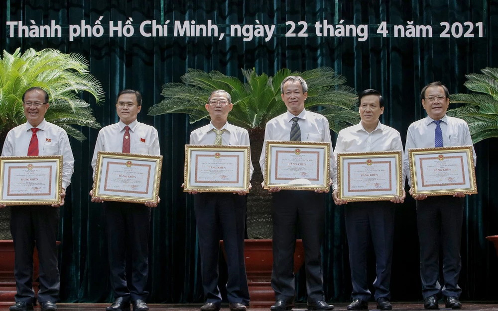 Ông Cao Thanh Bình (thứ hai từ trái sang) nhận bằng khen của Chủ tịch UBND TP.HCM vì đã có nhiều đóng góp cho hoạt động của HĐND khoá IX, nhiệm kỳ 2016-2021. Ảnh: NGUYỆT NHI