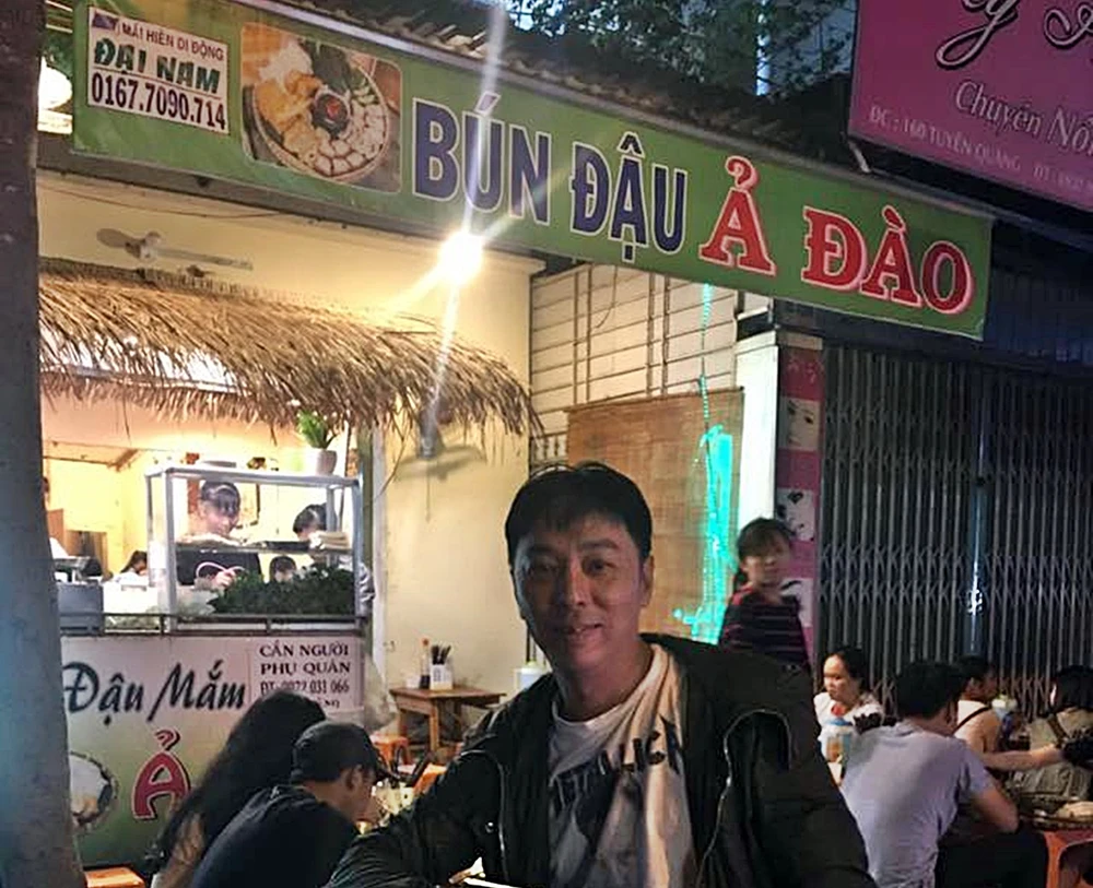 Nhạc sĩ Đinh Trung Hà tại quán bún đậu của vợ chồng anh (hình chụp trước dịch COVID-19).