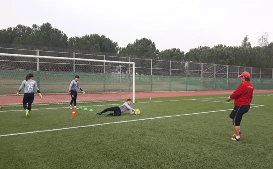 HLV thủ môn Kim Hồng tập luyện với các học trò.