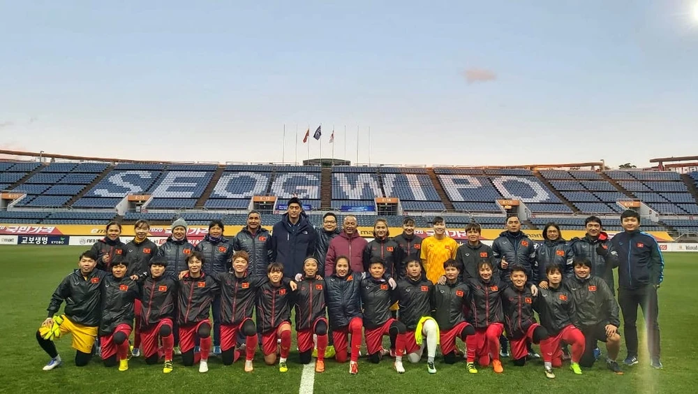 Các tuyển thủ nữ tập luyện trên sân Seogwipo. ẢNH: VFF
