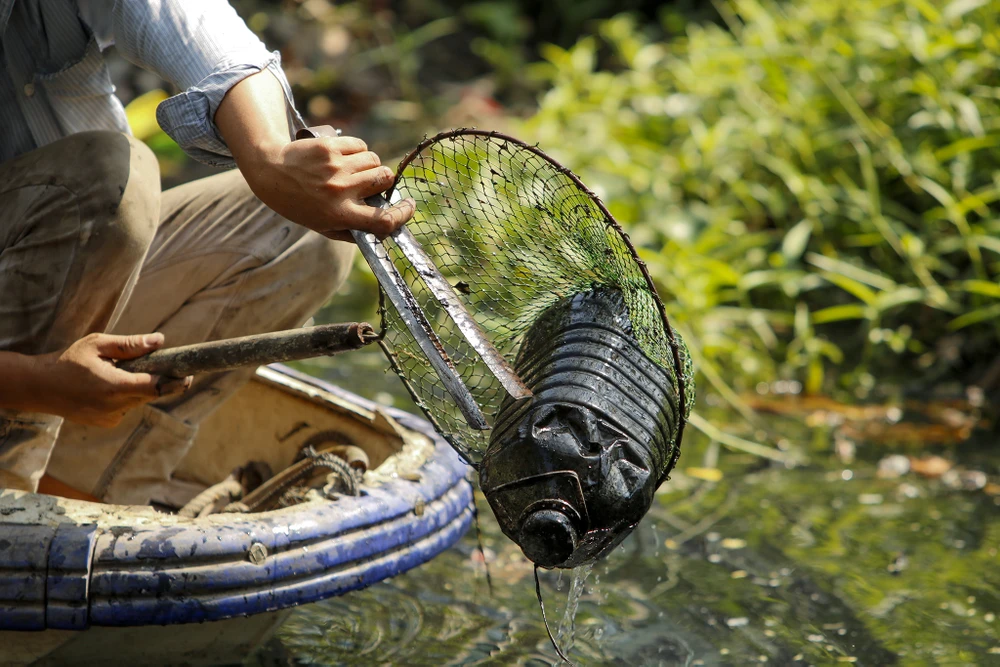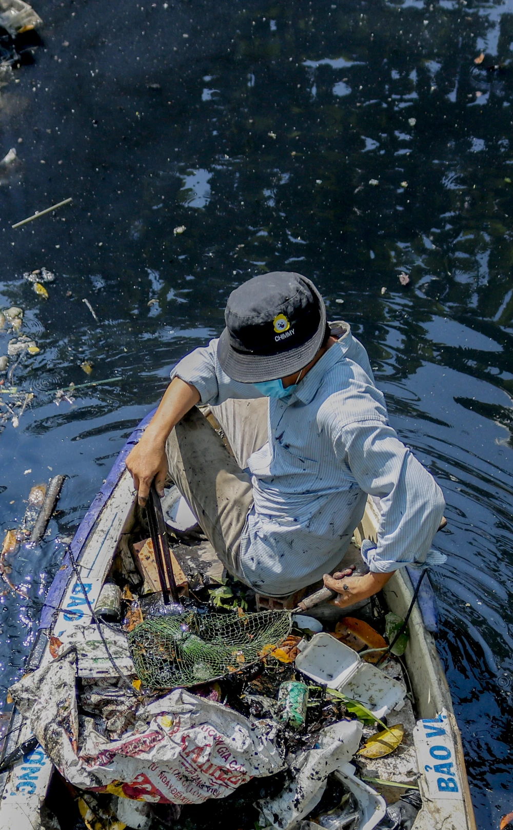Ông Cường cho biết, thời gian đầu, khi chưa có phương tiện, ông đã phải trầm mình xuống dòng nước đen vớt từng hộp nhựa, túi ni lông. “Sau mỗi lần như thế, tôi phải bỏ luôn bộ đồ vì không tài nào giặt sạch được, tay chân cũng thường xuyên bị lở loét, phồng rộp vì nước bẩn” – ông Cường chia sẻ.