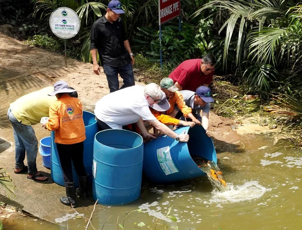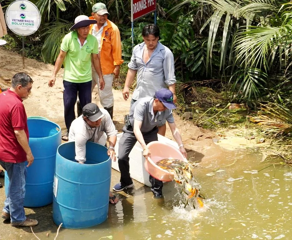 Nhân chuyến về thăm quê hương và làm việc tại Việt Nam, ông David Duong – Chủ tịch kiêm TGĐ Công ty TNHH Xử lý chất thải Việt Nam (VWS) đã trực tiếp cùng chuyên gia, người lao động của công ty đã thả hơn một triệu con cá xuống kênh Rạch Chiếu (một nhánh của sông Cần Giuộc), thuộc xã Đa Phước, Bình Chánh, TP.HCM.
