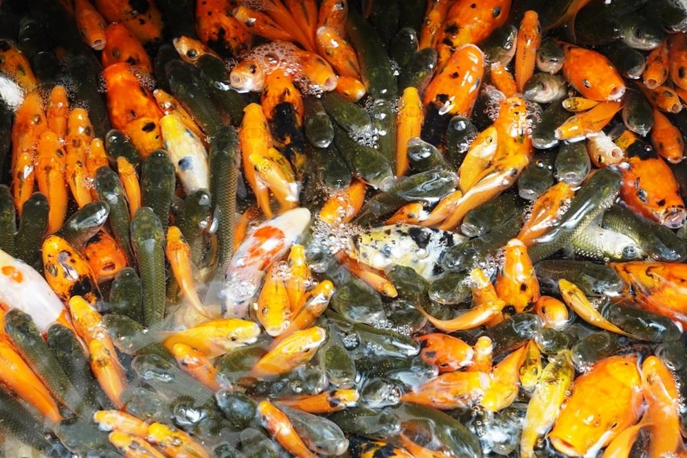 Đàn cá chép và điêu hồng chuẩn bị được thả xuống sông.