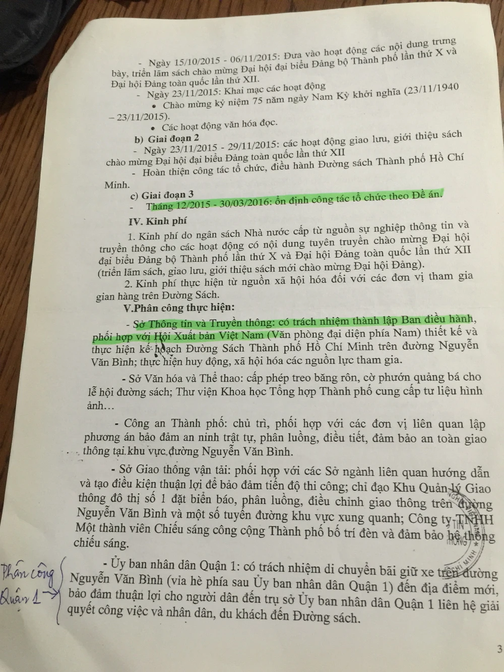 1/ Theo Kế hoạch số 6156/KH-UBTP về "Kế hoạch thực hiện Đường sách TP.HCM trên đường Nguyễn Văn Bình" do ông Hứa Ngọc Thuận, Phó Chủ tịch UBND TP.HCM, ký ban hành ngày 10-10-2015, tại điểm V. phân công thực hiện: "UBND quận 1 có trách nhiệm di chuyển bãi giữ xe trên đường Nguyễn Văn Bình (vỉa hè phía sau UBND quận 1) đến địa điểm mới, bảo đảm thuận lợi cho người dân đến trụ sở UBND quận 1 liên hệ giải quyết công việc và nhân dân, du khách đến Đường sách".