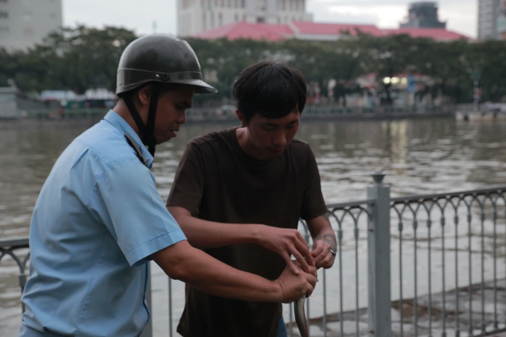 Ông Đoàn Ngọc Hải cho tịch thu cần câu và yêu cầu người vi phạm thả số cá câu được lại sông.