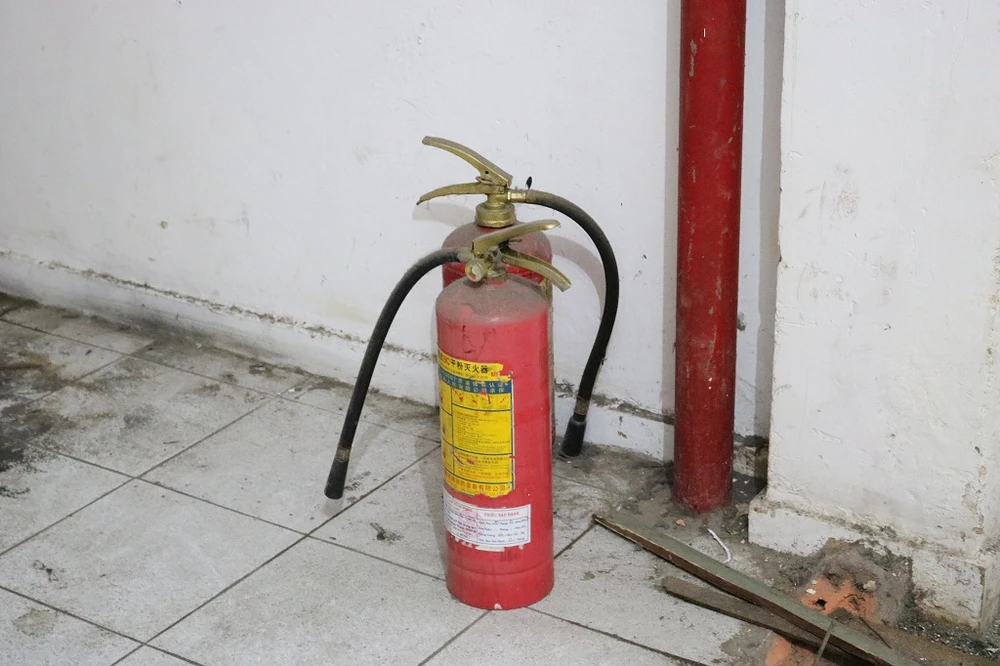 Không ai biết được những vật dụng chữa cháy này có còn hoạt động và có thể dùng được hay không khi thực sự có sự cố xảy ra. Ảnh: THANH TUYỀN