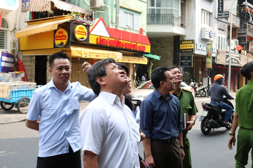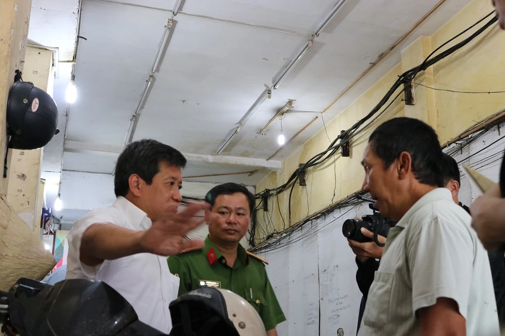 Ông Đoàn Ngọc Hải, Phó Chủ tịch UBND quận 1, dẫn đầu đoàn kiểm tra tiếp tục rà soát công tác đảm bảo an toàn PCCC tại các khu chung cư trên địa bàn quận 1. Ảnh: THANH TUYỀN