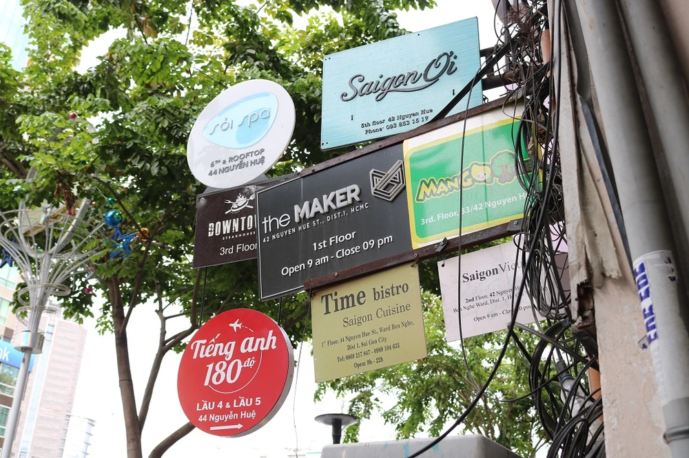 Đến gần 11 giờ sáng nay, các biển hiệu, quảng cáo trước chung cư 42 Nguyễn Huệ đã được tháo dỡ. Ảnh: THANH TUYỀN