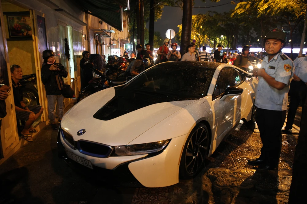 Chiếc xe BWM i8 vi phạm đậu trên vỉa hè đường Hoàng Sa bị đoàn kiểm tra xử lý.